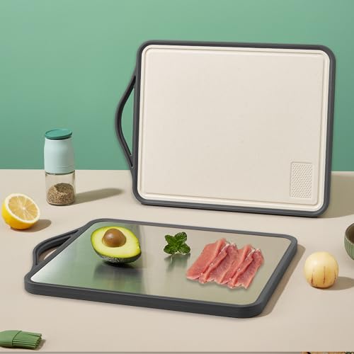 Pet Partisan - لوح تقطيع مزدوج الجوانب من الفولاذ المقاوم للصدأ الآمن غذائيًا وقش القمح والبولي بروبيلين بمبشرة مدمجة للحوم والفواكه سهل التنظيف ومضاد للانزلاق وآمن على غسالة الأطباق، كبير 40×30×1.7 سم (لون رمادي)