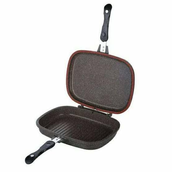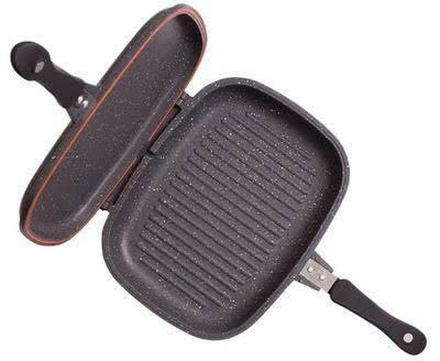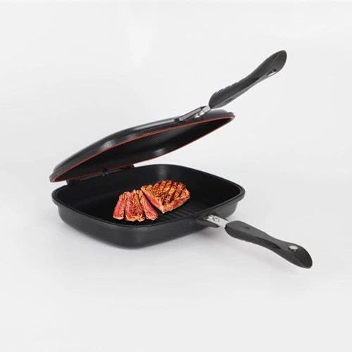- DOUBLE-SIDED DESIGN: Innovative grill pan features two cooking surfaces that clamp together, allowing you to cook food evenly on both sides simultaneously without the need for flipping
