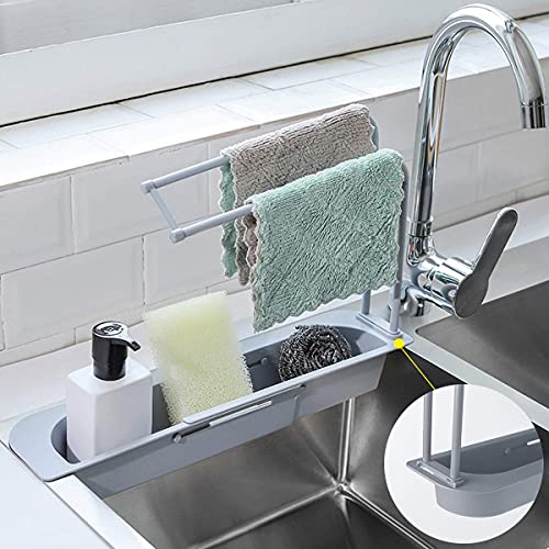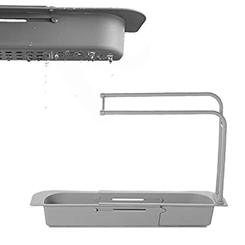 Litthing - رف تجفيف اطباق يثبت على الحوض، بتصميم تلسكوبي قابل للتوسيع والتعديل ومتوفر بـ4 الوان، مزود بحامل للصابون والاسفنجة مع سلة تصريف، للمطبخ المنزلي (رمادي)، بولي بروبلين