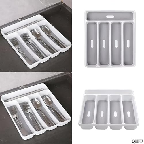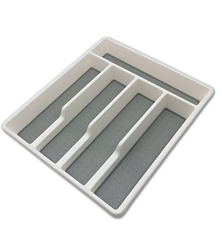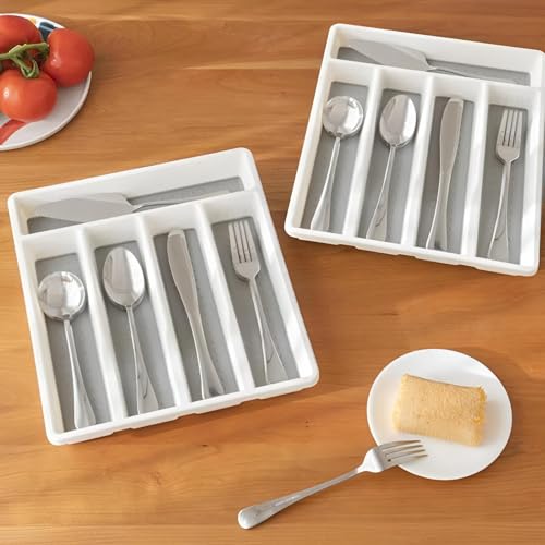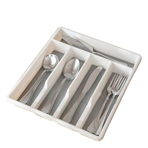 - This five-compartment cutlery organizer is designed with five distinct storage bays for knives, forks, spoons, and utensils, finished in a two-tone white-on-gray style, and sized at 9 inches long by 12.5 inches wide and 1.75 inches high to fit standard or smaller drawers, with a non-slip base to keep utensils secure.