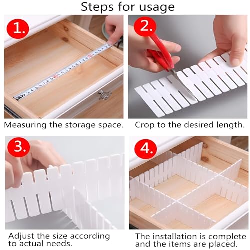- Adjustable and Flexible: These drawer dividers are made of high-quality plastic, which makes them durable and easy to install. No nails or glue are required, and you can set them up in various configurations to suit different small items. The dividers are also customizable by cutting them to fit any drawer size.