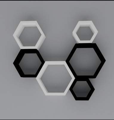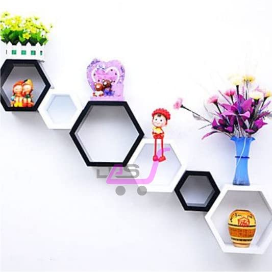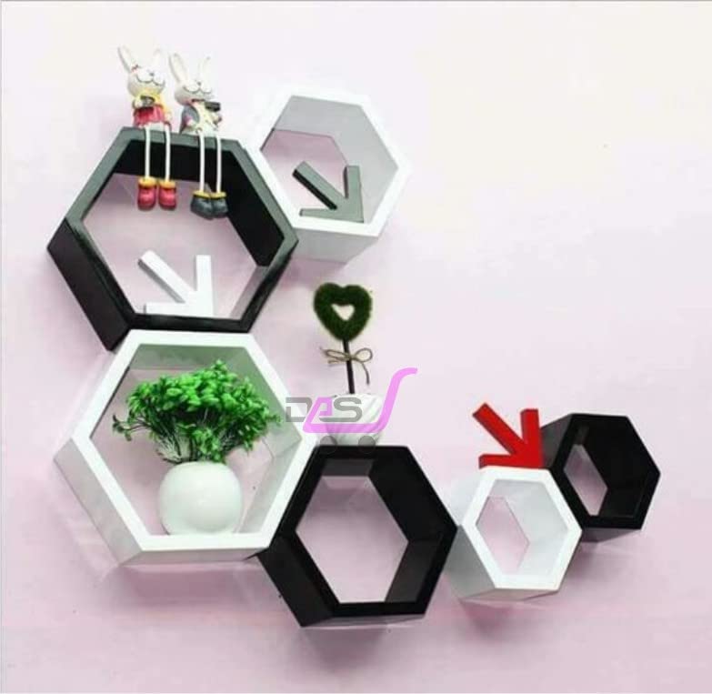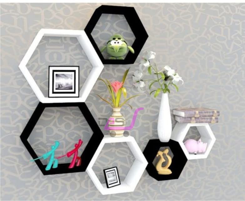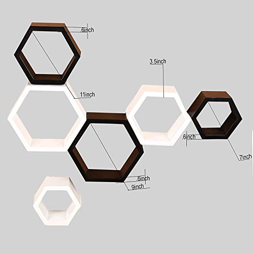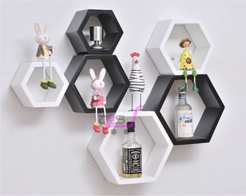 Dream Arts - رفوف جدارية عائمة خشبية سداسية الشكل لغرفة المعيشة من دريم ارتس، مجموعة من 6 قطع (اسود وابيض)