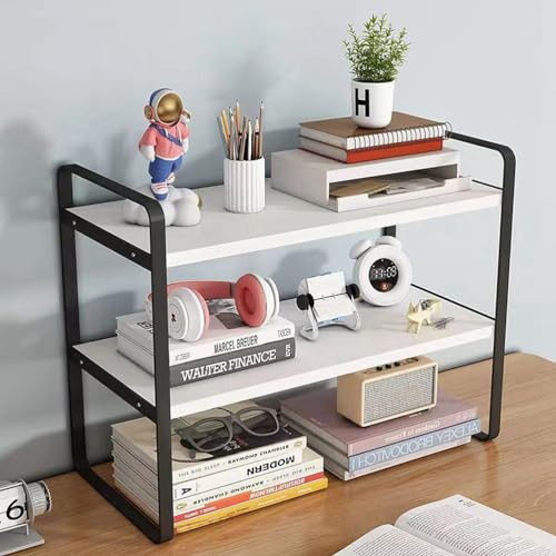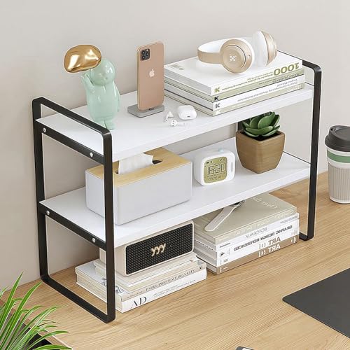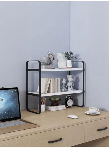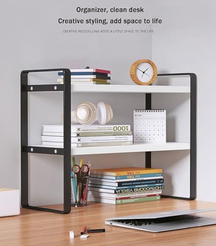 Dreamhousey - Iron+Wood Student Desktop Clutter Storage Bookshelf, Office Computer Desk Deskt File Organizer Rack 2-Tier cabinets Shelf (Black+White, 2-Tier)
