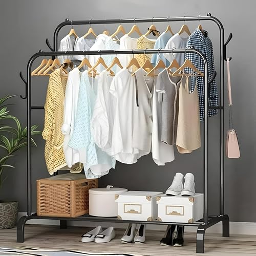 - This innovative storage solution features a unique double-rod design that effectively doubles your hanging capacity compared to standard single-rail units, allowing you to organize shorter items like shirts on the upper rail while reserving the lower rail for longer garments such as dresses and coats. This strategic vertical layering maximizes every inch of available space in your bedroom, making it an ideal choice for small apartments or rooms with limited closet area where efficient organizati