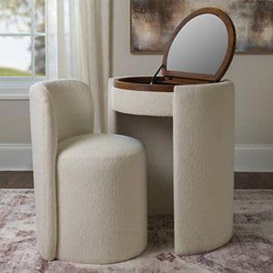 - Contemporary Table Decor Set: Includes built-in table with folding mirror and 2 upholstered cylinder seats to save space and style in the bedroom
