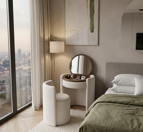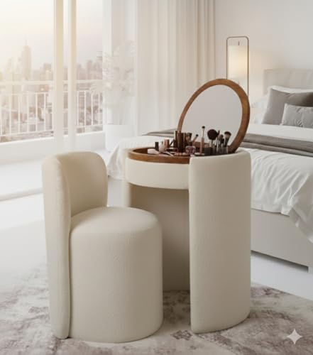 Generic - Dressing Table Set with Mirror and 2 Seats, Round Design, Cream, Modern Bedroom Furniture