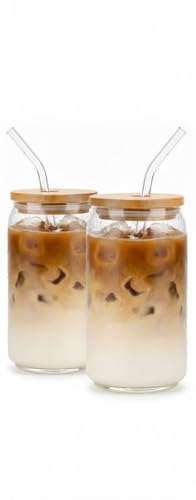 Generic - اكواب شرب مع غطاء من الخيزران وماصة زجاجية، كوب زجاجي للمشروبات الغازية والموهيتو والعصائر والقهوة المثلجة والكوكتيل والشاي والعصير، عبوة من قطعتين، 510 مل