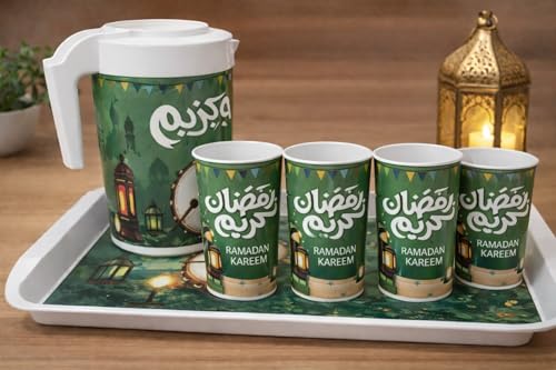 Generic - Drinkware Plastic-Glass (Plastic Drink Serving Set with Sunnyh and Jug and 2 Cups Ramadan Kareem Green)