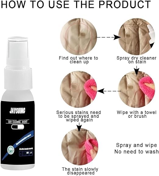- Dry clean no water or dry clean spray wash, no need to use water or put clothes in the washing machine after using. Just spray on the spot, wipe gently and allow to dry. No sticky marks or white marks when used properly, making them ideal for quick use at work, events, meetings or going out.