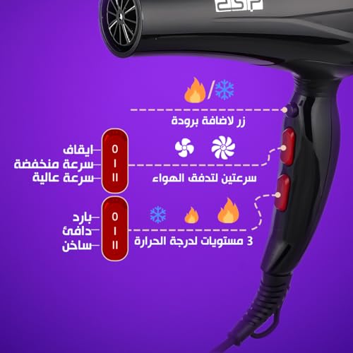 - 3 مستويات للسرعة. يوفر خيارات تجفيف متعددة لتناسب أنواع الشعر المختلفة واحتياجات التصفيف.