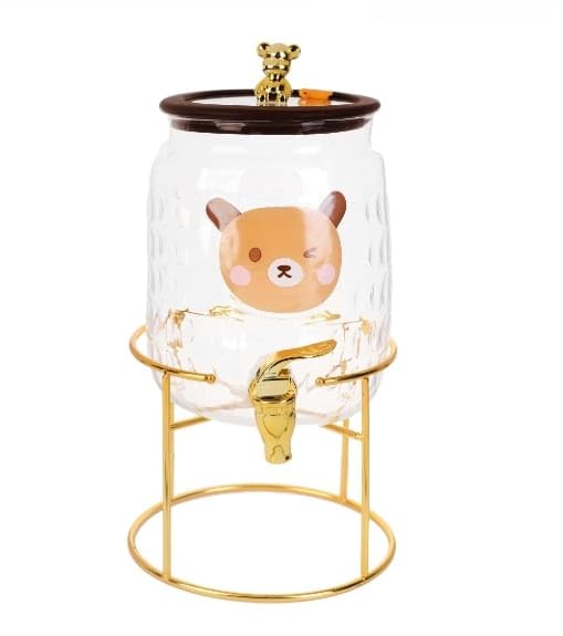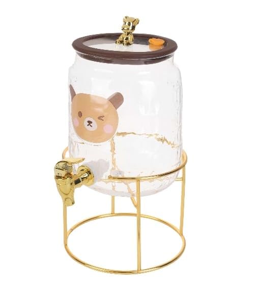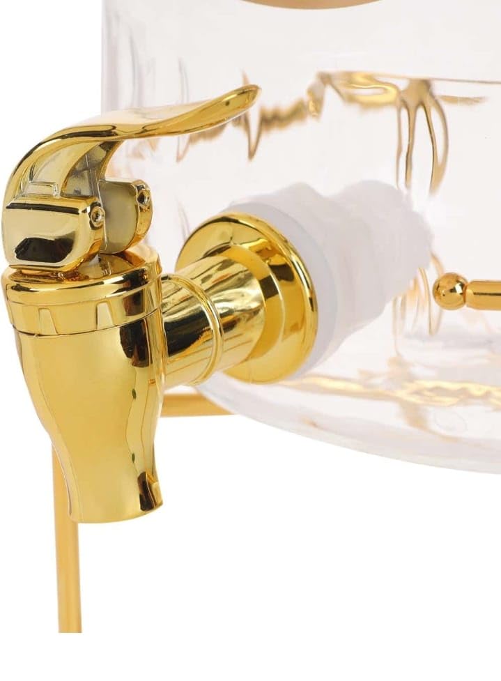 - Durable metal base provides strong stability and protects surfaces from scratches and spills. A luxurious gold transparent design adds a luxurious and elegant touch to any serving table. Practical, leak-proof spout allows for easy, mess-free dispensing of beverages Airtight lid prevents the entry of dust and insects, keeping drinks clean and fresh. The stylish and stylish design makes it a great addition to your kitchen or dining room decor. Elegant metal base adds flair and adds stability on different surfaces Suitable for homes, restaurants, cafes, parties and making it versatile. Easy to fill and refill