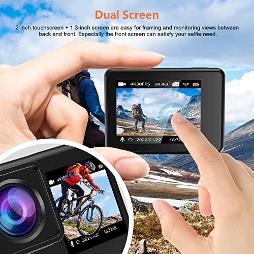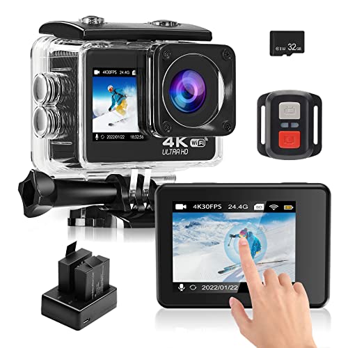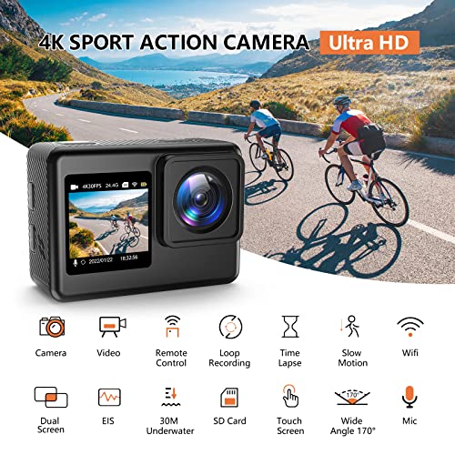 Alldeer - Dual Screen Action Camera 4k 30M Underwater Cameras Touch Screen Helmet Camera EIS Sports Camera WIFI Video Recorder For Riding Traveling with 170°Wie Angle Mic Remote 2 Batteries Mounts kit