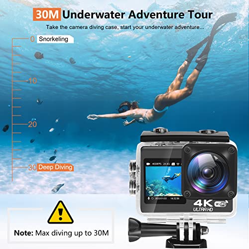 - 30M Underwater Camera: Alldeer sports camera suitable for water sports. 4K action cam comes with IP68 waterproof housing. place the digital camera into the waterproof case and securely fasten it, then allow to dive(Max 30M deep diving). In addition,waterproof cameras coming with tons of free accessories.Under water camera can DIY mount to fit various indoor and outdoor extreme activities, such as swimming, surfing, snorkeling and diving.