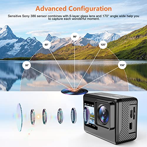 - Dual Screen 4K Action Camera: Alldeer ultra HD action cam adopt to Sony 386 sensor with 6 layer glass lens, so video resolution up to 4K 60fps & 2.7K 60fps, 20MP image resolution and 30 frames per second perfect for capturing each wonderful moment of outdoor sports. Dual screen design is easy for framing and monitoring views between back and front. Especially the front screen can satisfy your selfie need. More convenient than the single-screen camera.