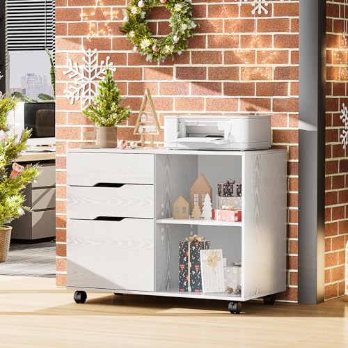 DUMOS - DUMOS 3 Drawers Lateral File Cabinet, Rolling Wooden Printer Stand Under Desk Storage Organizer with 4 Wheels Adjustable Shelf for Office Home, Whitewood