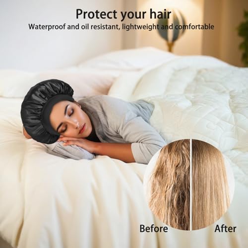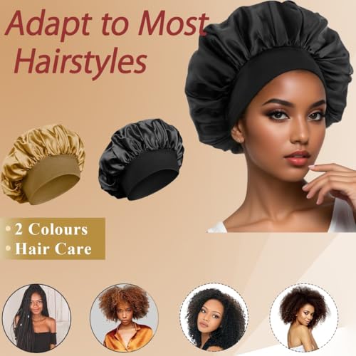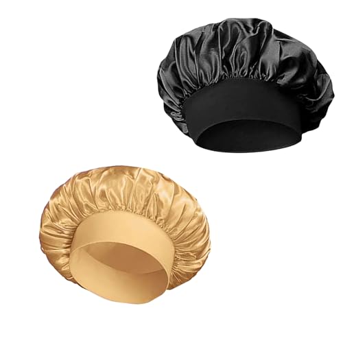 Duomama - Satin Silk Hair Bonnets - Soft Sleep Caps (2 Pack, Black and Gold) - Elastic Band for Comfortable Sleeping - Protects Hairstyles Overnight - Stylish Hair Wrap for Healthy Hair