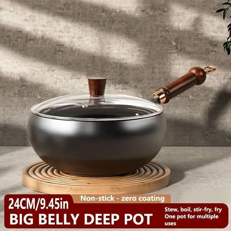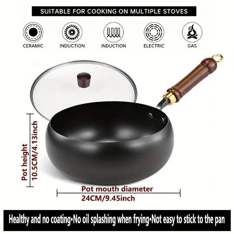 - Featuring a long wooden handle and a glass lid, this skillet offers ergonomic comfort and enhanced visibility during cooking. The lightweight design reduces fatigue, while the lid helps retain moisture and flavors—perfect for steaming, slow-cooking, or simmering Asian dishes with authentic taste.