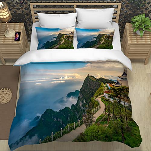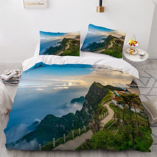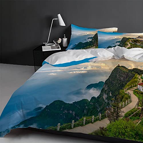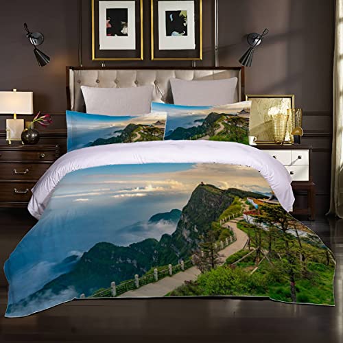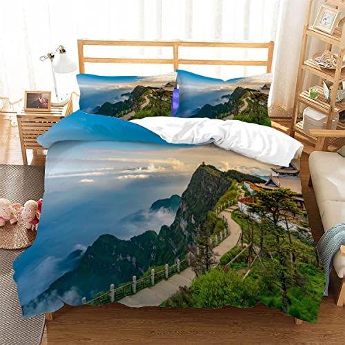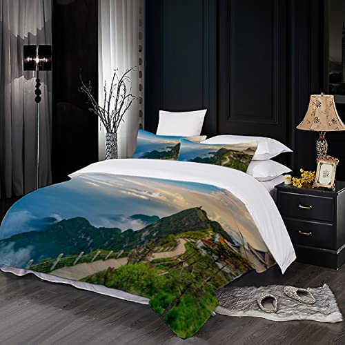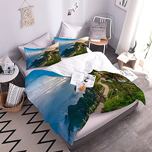 SDFWEWQ - Duvet Cover Blue Double Size Clouds And Houses On The Mountain,3 PCS Bedding Set Wrinkle Fade Resistant Soft Comfy Hypoallergenic Anti Allergic Microfiber Quilt Covers and 2 Pillowcases 19.7x29.5 inch