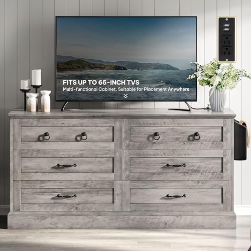 DWVO - DWVO Farmhouse 6 Drawers Dresser with Air-Purifier, 59" Wide Wood Rustic Chest of Drawers with Nice Texture, Vintage Design, Storage Dressers Organizer for Living Room, Hallway, Grey