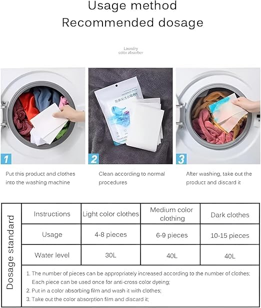 - مثالية لجميع أنواع الغسيل، تعمل هذه الأوراق بكفاءة مع الأقمشة الملونة والبيضاء ويمكن استخدامها بأمان على المنتجات ذات الأنماط والخطوط بدون التأثير على جودتها. لا داعي للقلق بشأن نزيف الألوان، حيث تمتص هذه الأوراق الأصباغ من ماء الغسيل بكفاءة، مما يضمن بقاء الملابس متعددة الألوان نابضة بالحياة ومنفصلة طوال دورة الغسيل.