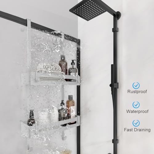 - 【ارتفاع قابل للتعديل】: ارتفاع مرن بين رفوف الدش يجعل من السهل عليك تخزين البرطمانات ذات الارتفاعات المختلفة. يمكنك ضبط الارتفاع حسب احتياجاتك، وليس فقط برطمانات مستحضرات التجميل الصغيرة (اللوشن والكريمات وما إلى ذلك. )، أو حتى أطول زجاجات الشامبو والبلسم.