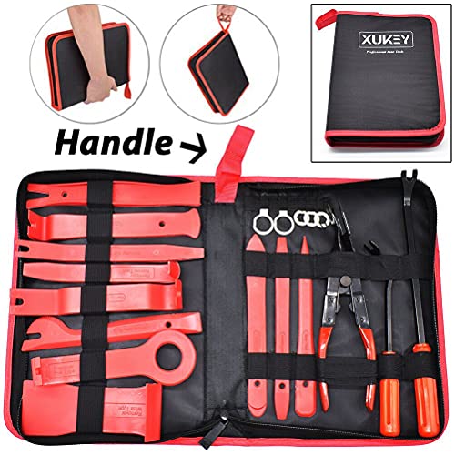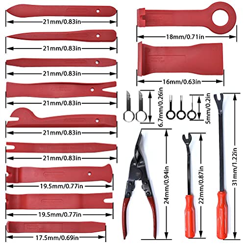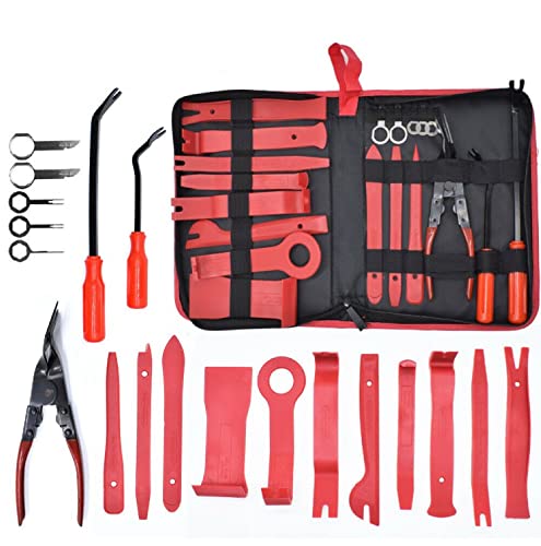 E-Universal - مجموعة ادوات ازالة الحواف من 19 قطعة كماشة مشبك اوتوماتيكي ومزيل طرفي للتثبيت مع شنطة تخزين فك بلاستيكية لراديو السيارة وحافة الباب وغيرها اي-يونيفرسال أحمر