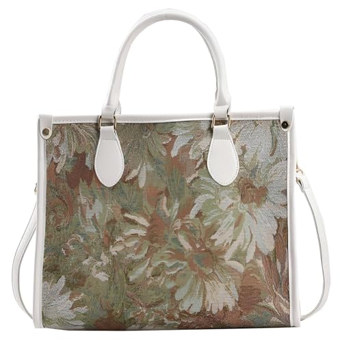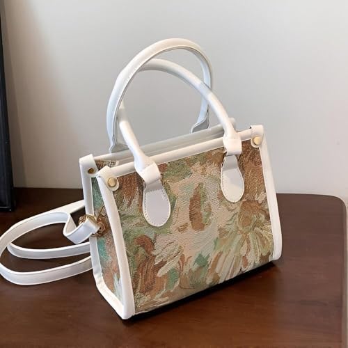 Generic - شنطة بنمط ايرث تون - مع طباعة زهور وتفاصيل جلدية بيضاء وخطوط معدنية وتصميم منظم لتصميم انيق متعدد الاستخدامات