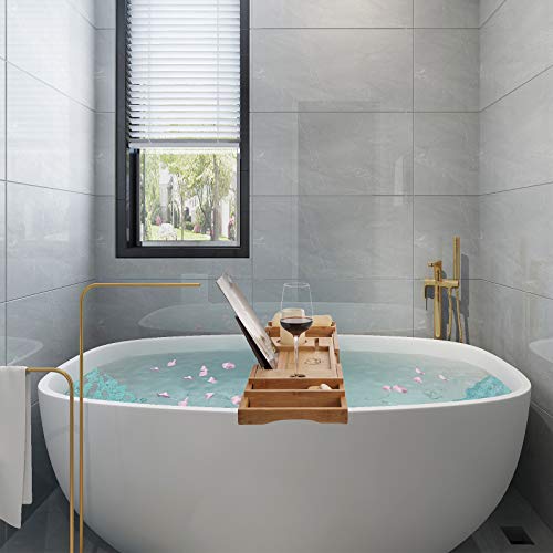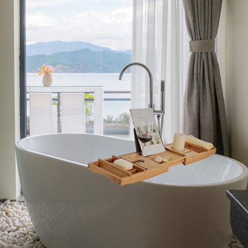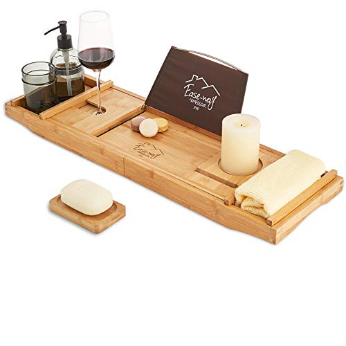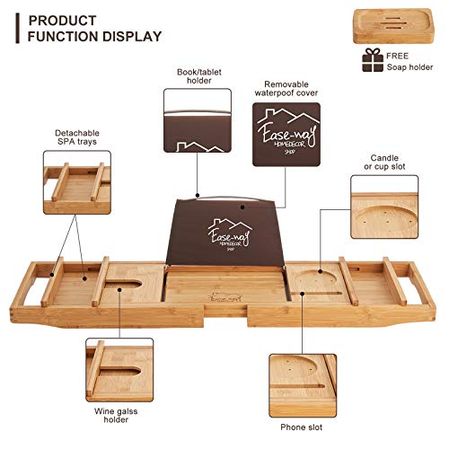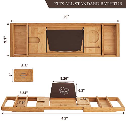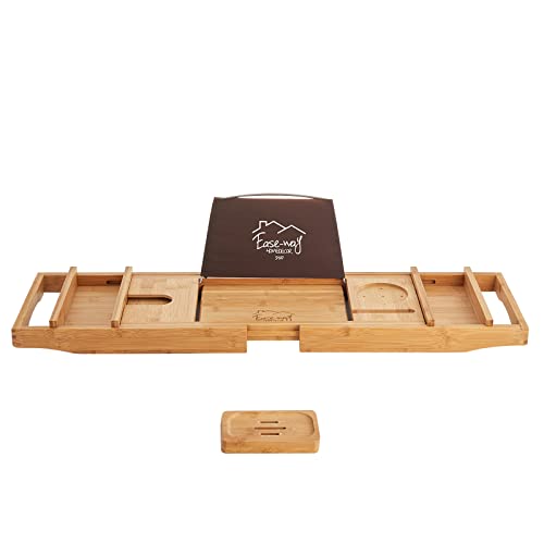 EASE-WAY - Bamboo Bathtub Caddy Tray, Wooden Bath Tray for Tub with Book Holder and Free Soap Dish, Holds Phone, Laptop, Extendable Bathtub Caddy Organizer for Luxury Spa (Natural)