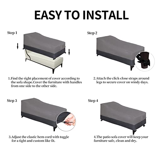 - All-Round Protection: The furniture cover can protect your sofa from rain,sun, snow, wind, dust, etc. Click close-straps around furniture leg can prevent the cover from being blown off on windy days. Elastic hem cord with toggle allows for a tight and custom-like fit.