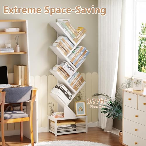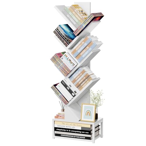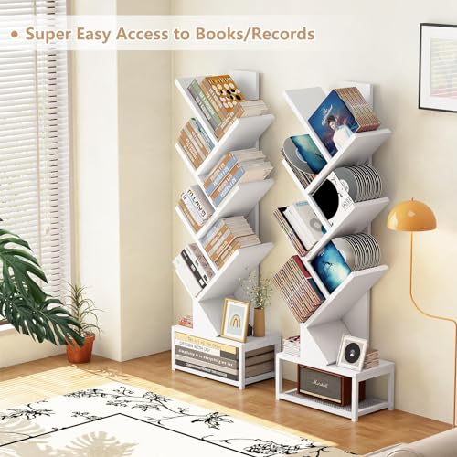 EasyCom - EasyCom 7 Tier Bookself with Metal Base, Tree Bookcase Floor Standing Bookshelf Organizer for CDs/Books, Bookshelves for Bedroom/Living Room/Home Office, White