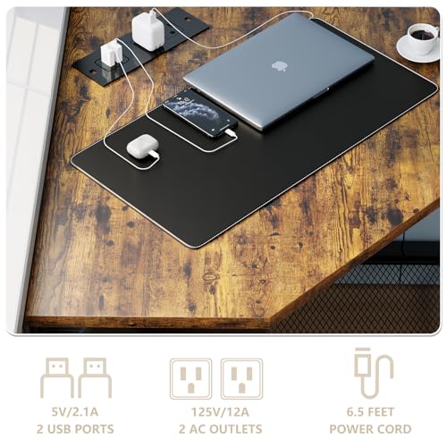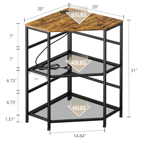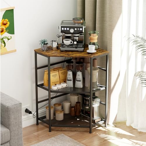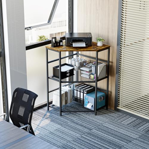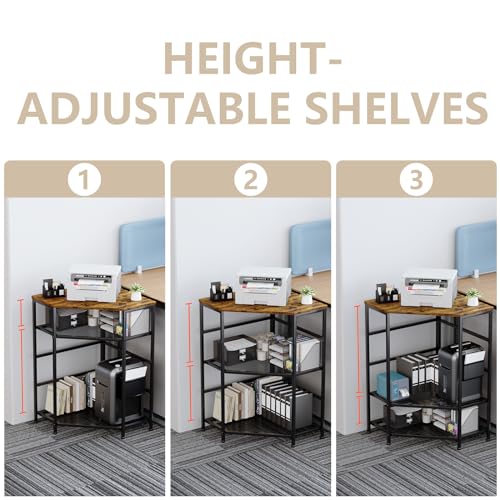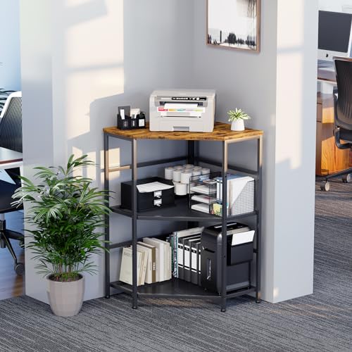 EasyCom - EasyCom Corner Printer Stand with Charging Station, Adjustable Height Storage Shelf for CPU Shredder, Triangle Corner Table for Small Space Office Living Room-Rustic Brown