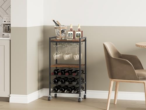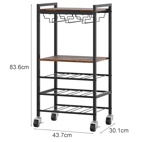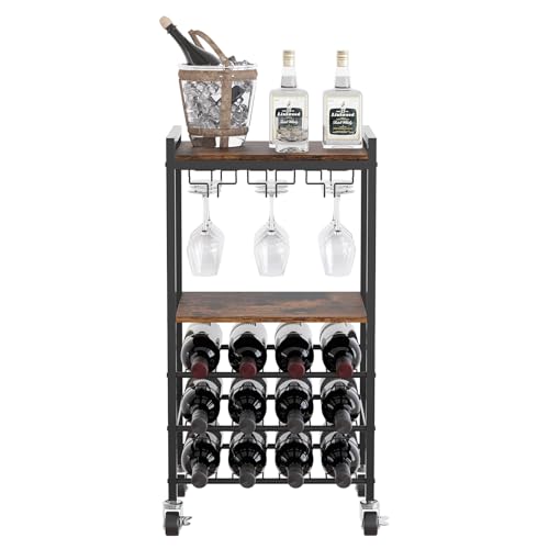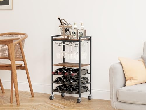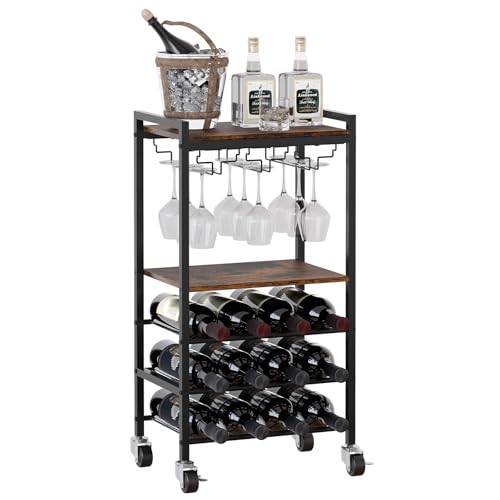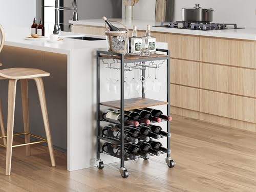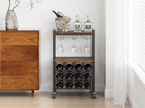 EasyPAG - EasyPAG Metal Wooden 12 Bottles Wine Racks Free Standing Floor,Wine Trolley on Wheels,Wine Bottle Organiser with Glass Holder,Home Kitchen Wine Storage Shelves,Brown