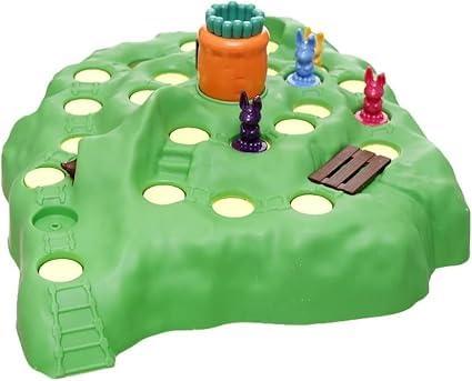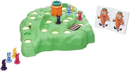 - Contents: the game includes a green 3D board, rabbit and carrot figures, assorted game cards, and brightly colored play pieces