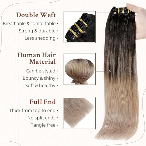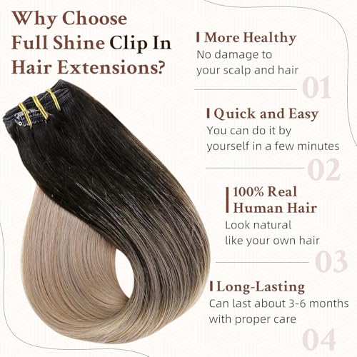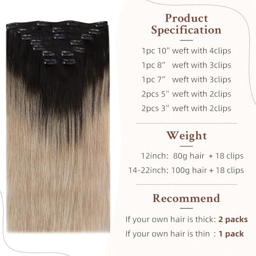 ECIF - Blonde Extensions 14 Inch Clip in Hair Extensions Human Hair Color 1B Off Black Fading to 18 Ash Blonde 120 Gram Human Hair Extensions 7Pcs Clip in Human Hair for Women