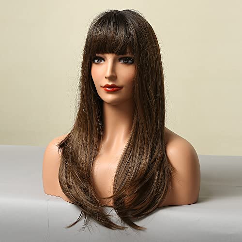 ECIF - Brown Wigs For Women Long Straight Layered Wig With Bangs Heat Resistant Fiber Synthetic Wigs Daily Natural Looking
