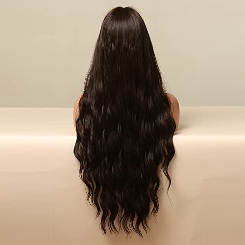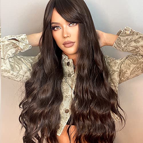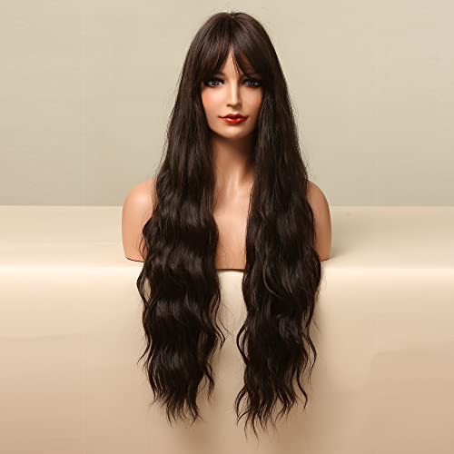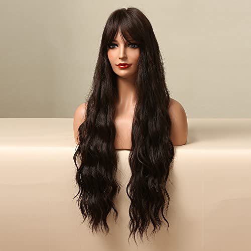 ECIF - باروكة شعر صناعي طويل مموج بلون بني غامق للنساء ذوات البشرة السمراء والبيضاء، باروكة شعر مع غرة للحفلات التنكرية مقاومة للحرارة العالية من ايسيف - مقاس 71 سم