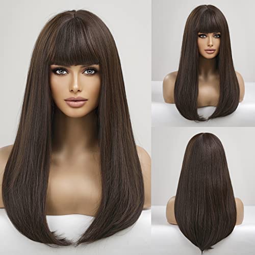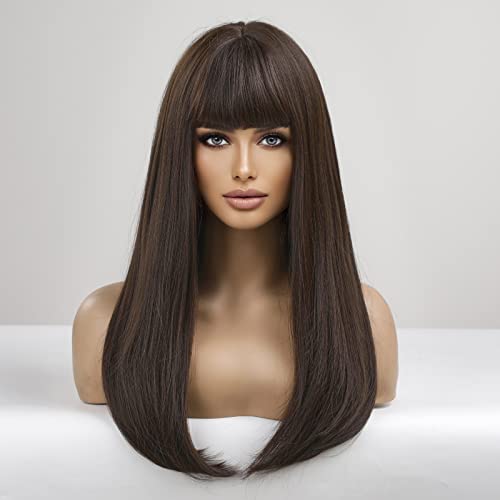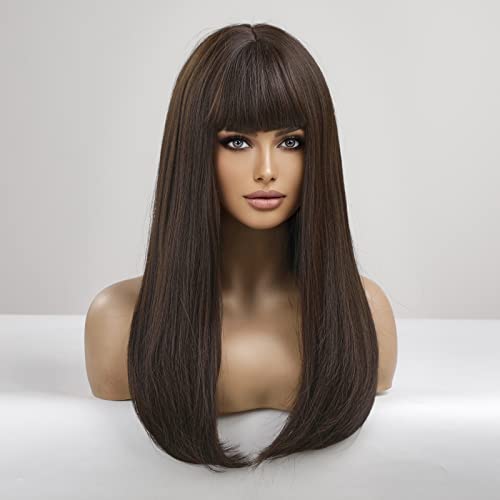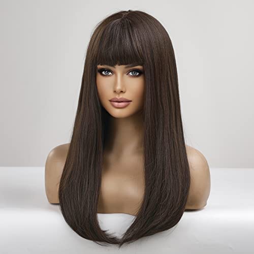 ECIF - Long Dark Brown Wigs For Women, Synthetic Hair Wig With Neat Bangs For White Women