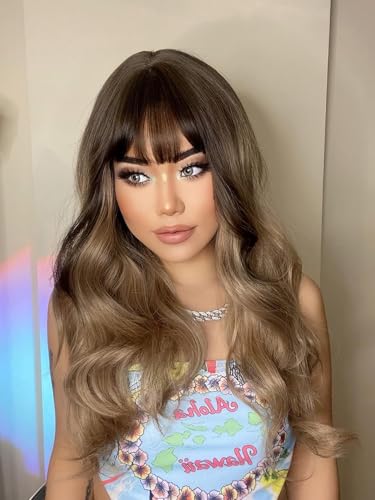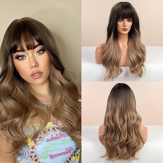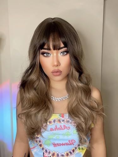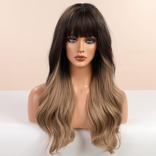 ECIF - Long Wig with Bangs Natural Wavy Wigs for Women Ombre Brown to Blonde with Dark Roots Heat Resistant Hair Long Wigs for Daily Party(Ombre Dark Blonde)