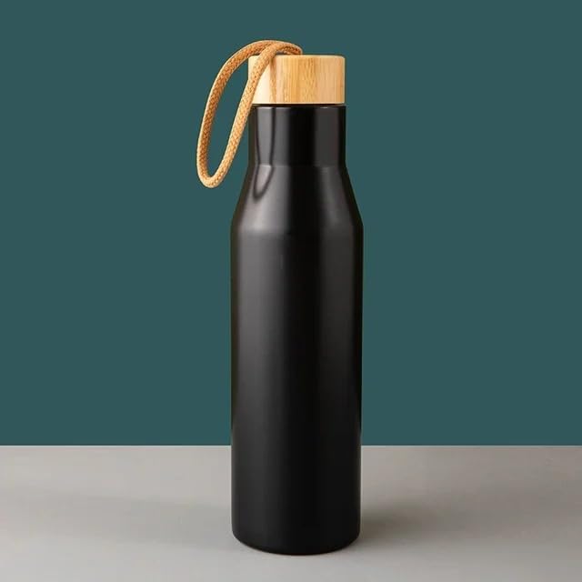 Generic - زجاجة مياه صديقة للبيئة من الستانلس ستيل سعة 500 مل - قارورة مزدوجة الجدار مع غطاء من الخيزران، مقاومة للتسرب والصدمات، مثالية للسفر والرياضة والهدايا (اسود)