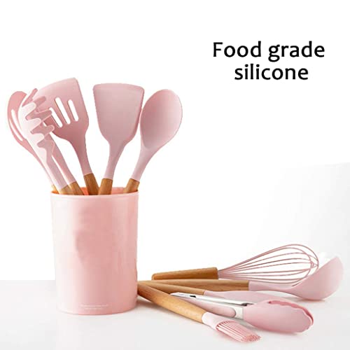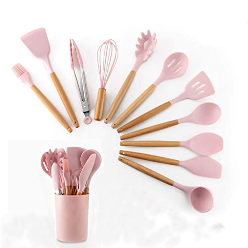 Eco Shopee SHOPPING SIMPLIFIED - 12pcs Wooden Handle Silicone Cooking Spoon Set High Temperature Resistant Silicone Spatula Kitchen Utensils (Pink)
