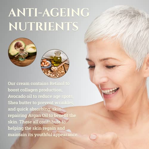 - كريمنا يحتوي على ريتينول لتعزيز الكولاجين، زيت أفوكادو لتقليل البقع العمرية، زبدة الشيا لمنع التجاعيد، وزيت الأرجان سريع الامتصاص لإصلاح البشرة. تساهم جميعها في مساعدة البشرة على استعادة مظهرها الشبابي والحفاظ عليه.