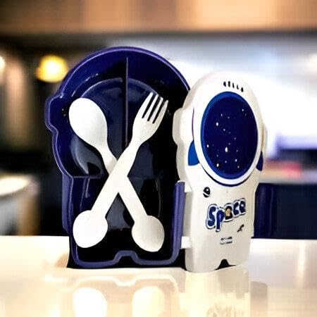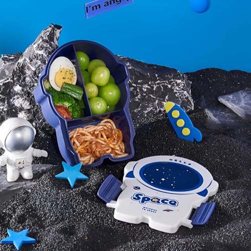 Generic - Educational Lunch Container - Space Explorer Themed Divided Box with Sturdy Clips, Blue/White Colors, Includes Matching Spoon, Suitable for Children’s School and Outings