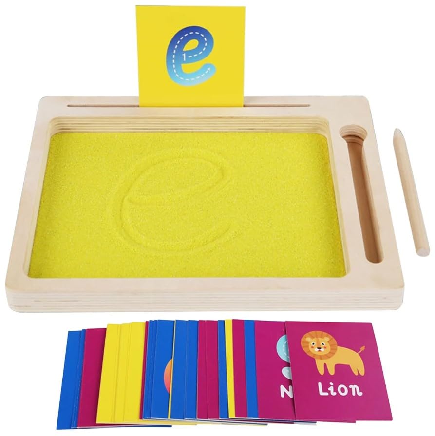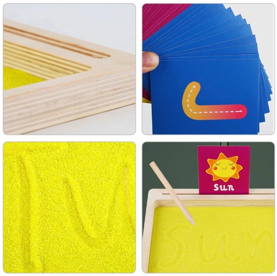 - محتويات المنتج: صندوق رمل خشبي مع سطح رملي أصفر، قلم خشبي للكتابة، ومجموعة بطاقات تعليمية ملونة تحتوي على حروف وأرقام وصور حيوانات