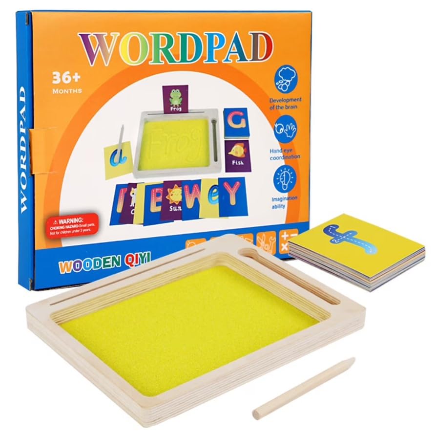 - طريقة الاستخدام: يمكن للطفل استخدام القلم الخشبي لرسم الحروف والأرقام والأشكال على السطح الرملي، ثم مسحها بسهولة لإعادة الاستخدام مرات عديدة