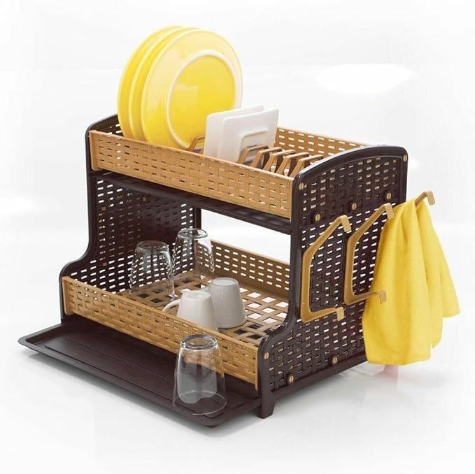 Generic - Efficient Drying Rack - Double-Top Plastic Plate and Cup Drainer with Water Collection System and Convenient Hooks for Towels, Space-Saving Design, Ideal for Modern Kitchens
