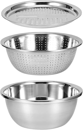 - ALL IN ONE KITCHEN MAGIC: Replace three separate tools with this ingenious 3-in-1 set. The versatile unit functions as a sturdy mixing bowl, a efficient colander for draining pasta and washing veggies, and a built-in stainless steel grater for cheese and vegetables, saving you precious cabinet space and simplifying your cooking routine.