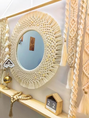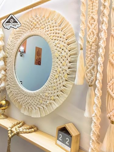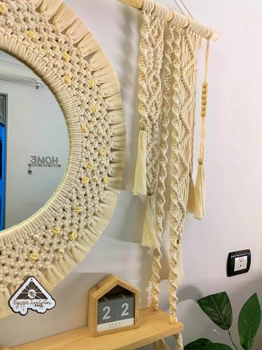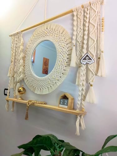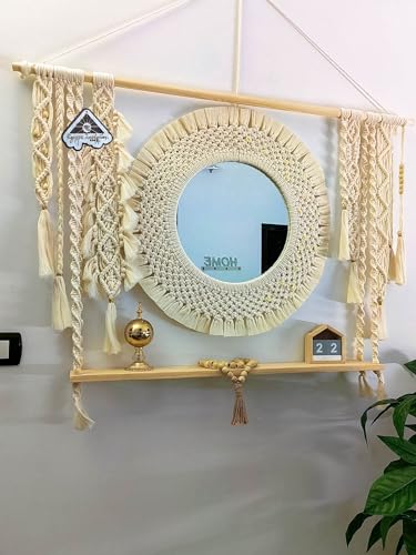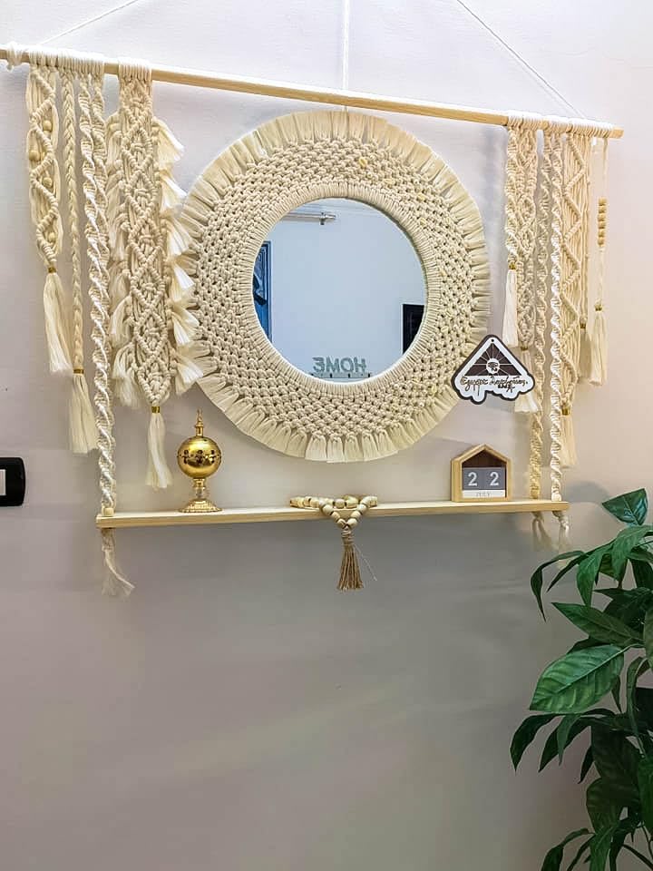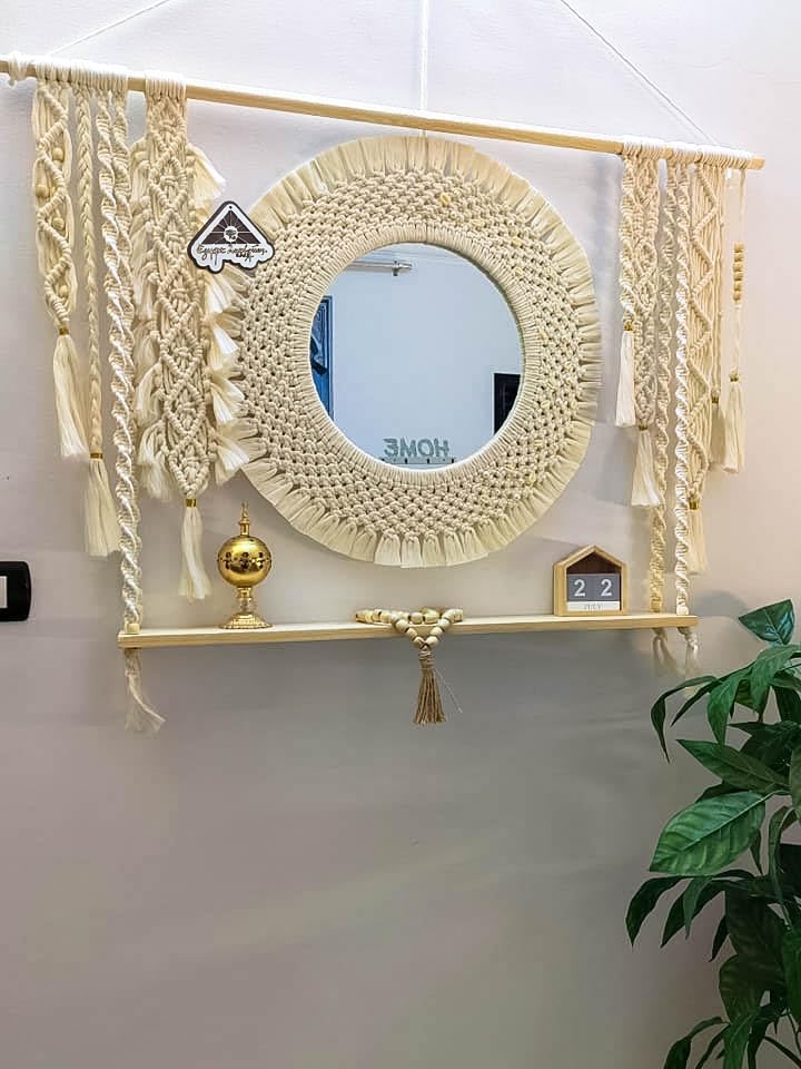 - مراية مكرمية انتيكس دائرية مصنوعة يدويا مع رف خشب من ايجيبت انتيكس.