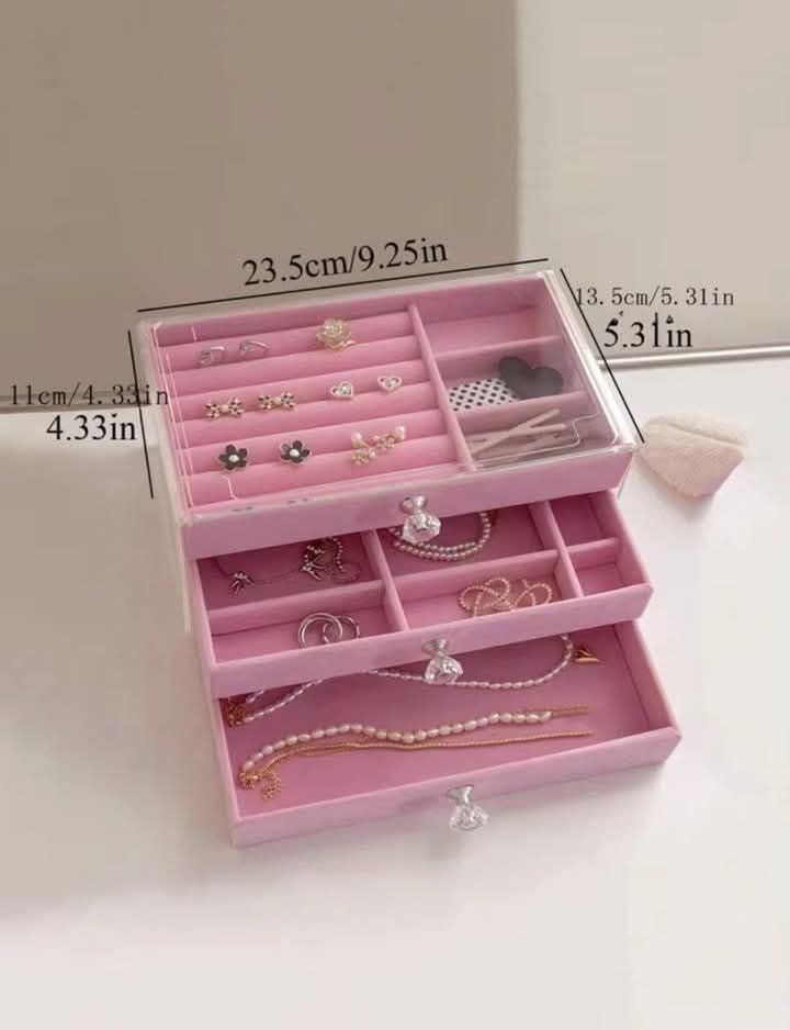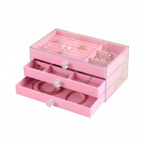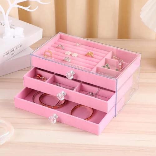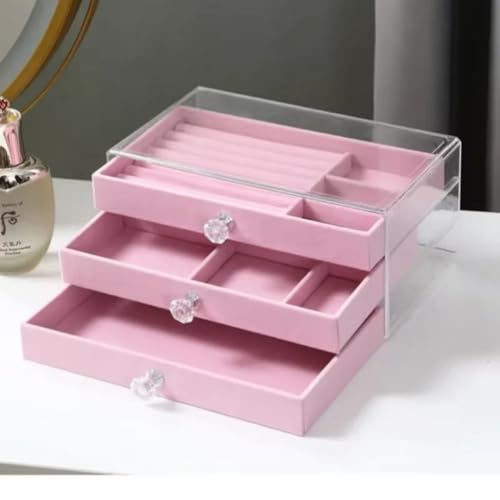 Generic - صندوق منظم مجوهرات اكريليك شفاف مكون من 3 طبقات من ايجيبت هاب | شنطة تخزين مبطنة مخملية بلون زهري مقاومة للغبار | ادراج للخواتم والاقراط والقلائد والاساور
