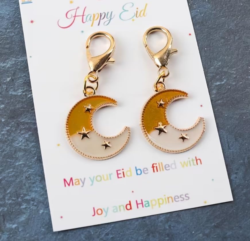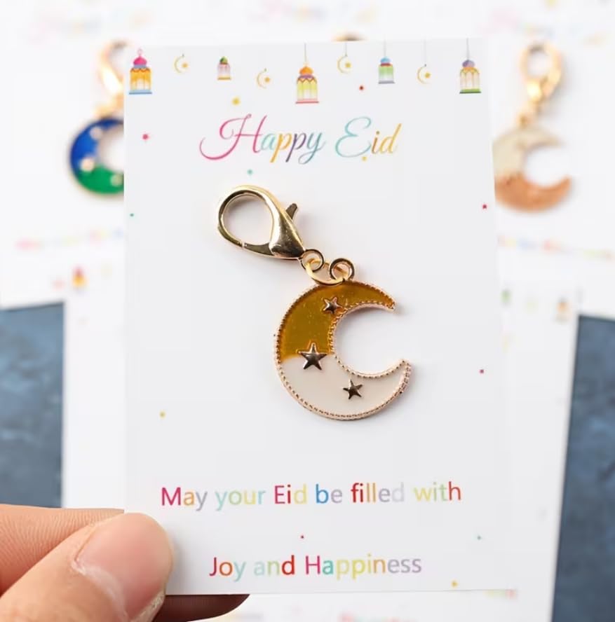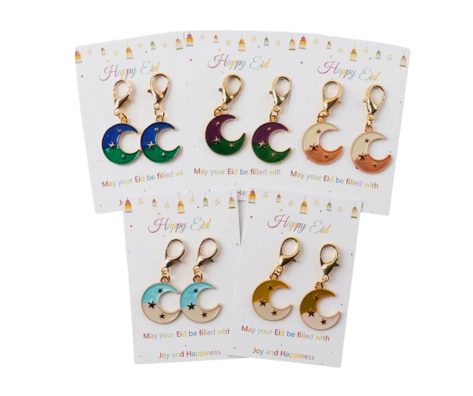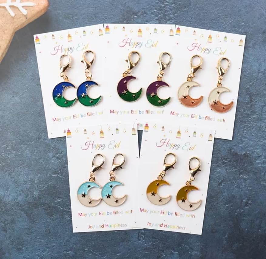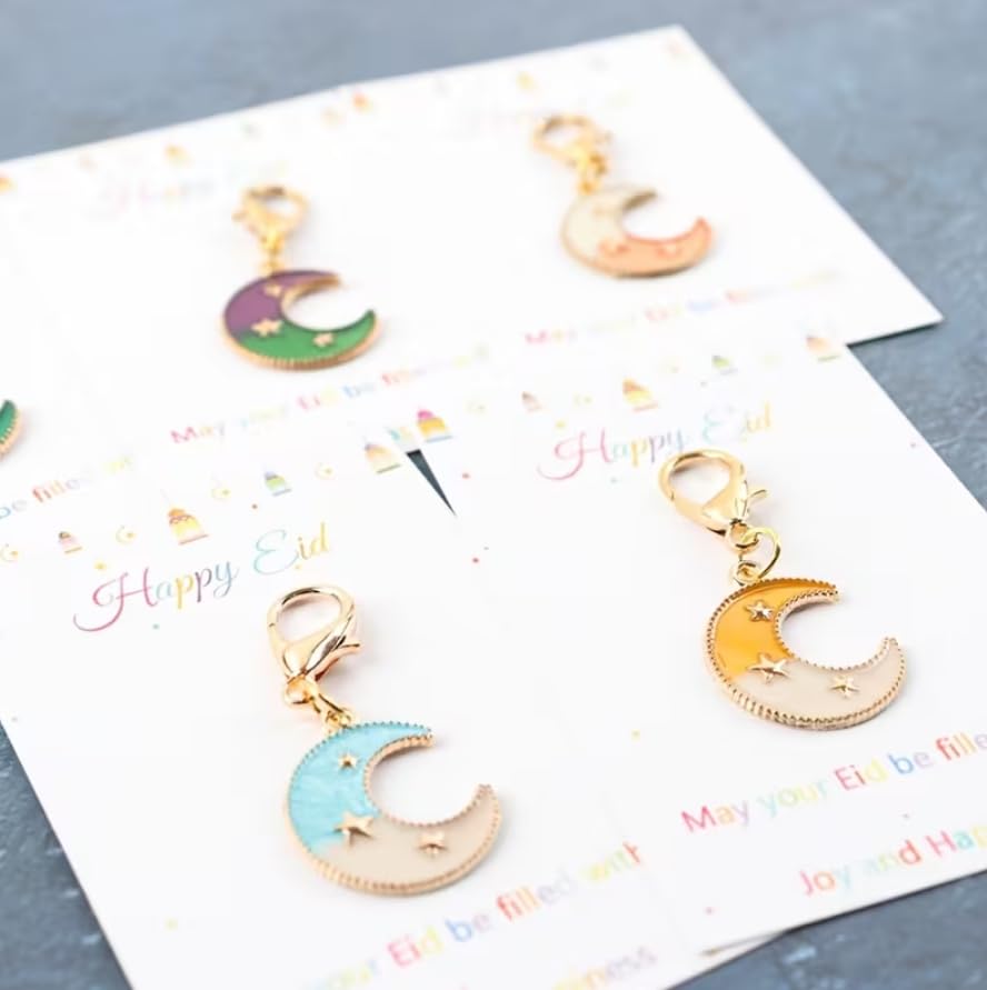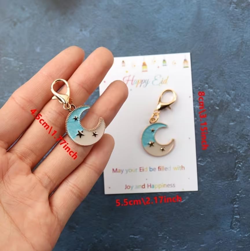 Generic - Eid Gift Keychain with Moon Charm, Eid Mubarak Happy Eid greeting Card with Gift Random Colour - Eid Al-Fitr Gift for Family & Friends – Colorful Moon & Star Design Keyring Party Favor – 1 Piece