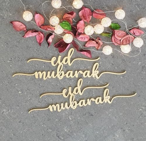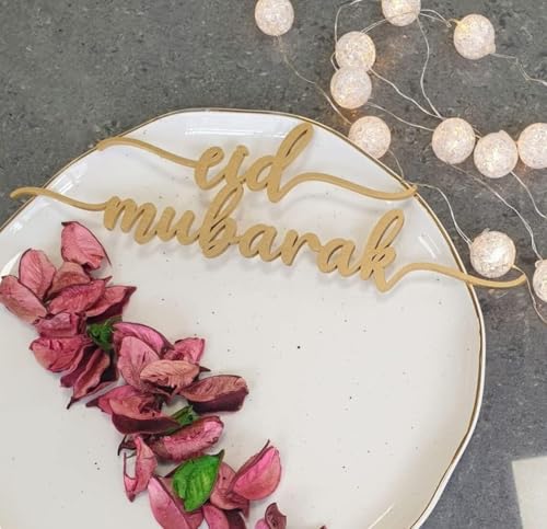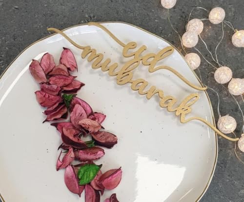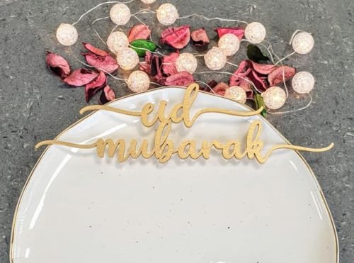 - A gold-colored, laser-cut wooden or acrylic decoration with the phrase "Eid Mubarak" in a cursive font is placed horizontally across the top of the plate.